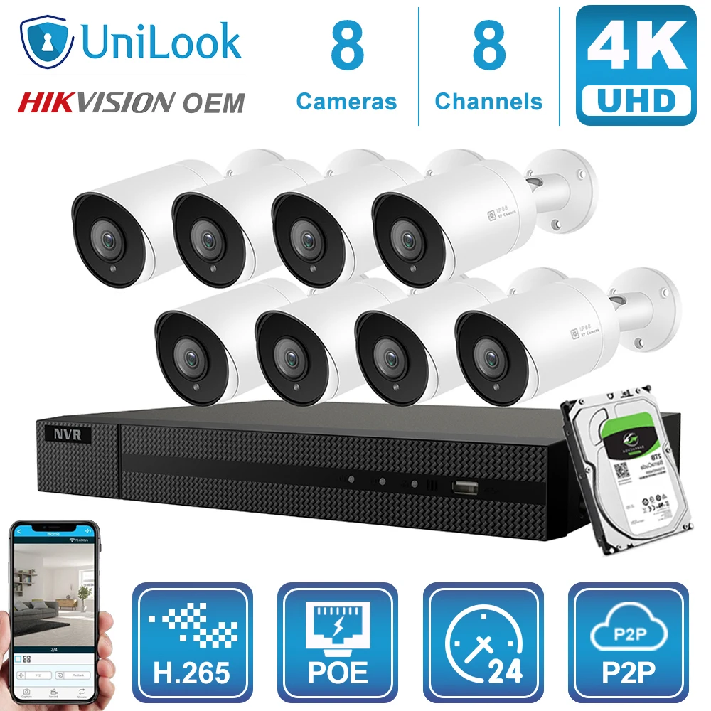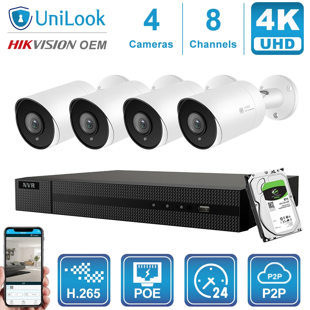 Hikvision OEM 8CH 4K NVR 8MP Bullet POE IP Camera 4/6/8PCS Outdoor Security systems ONVIF H.265 CCTV NVR Kits With 1/2/4TB HDD