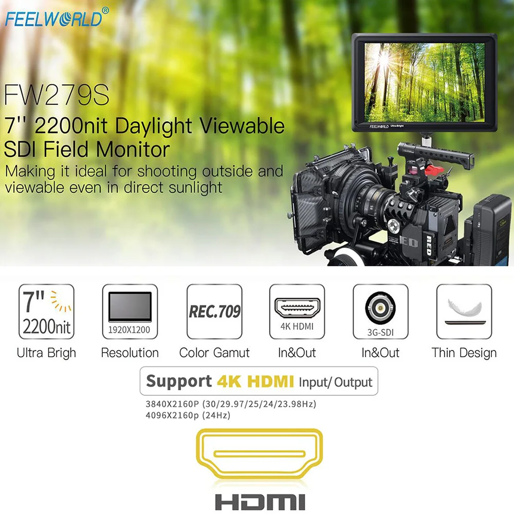 FEELWORLD FW279S 7 Inch IPS 2200nits 3G-SDI 4K HDMI Camera Field Monitor 1920X1200 DSLR Monitor for Shooting Video Filmmaking